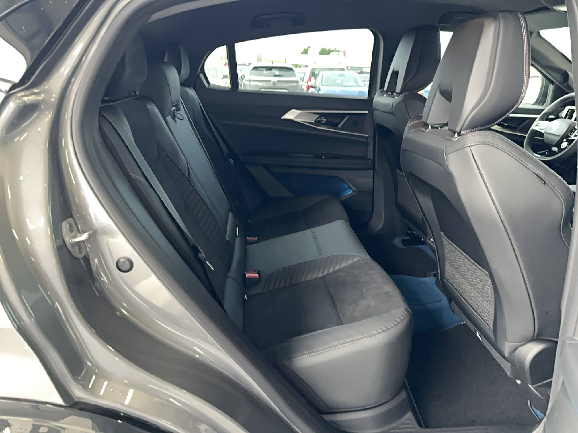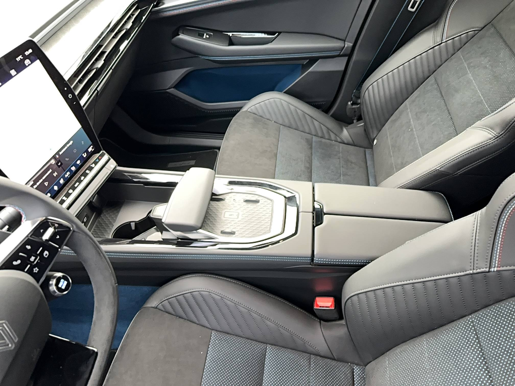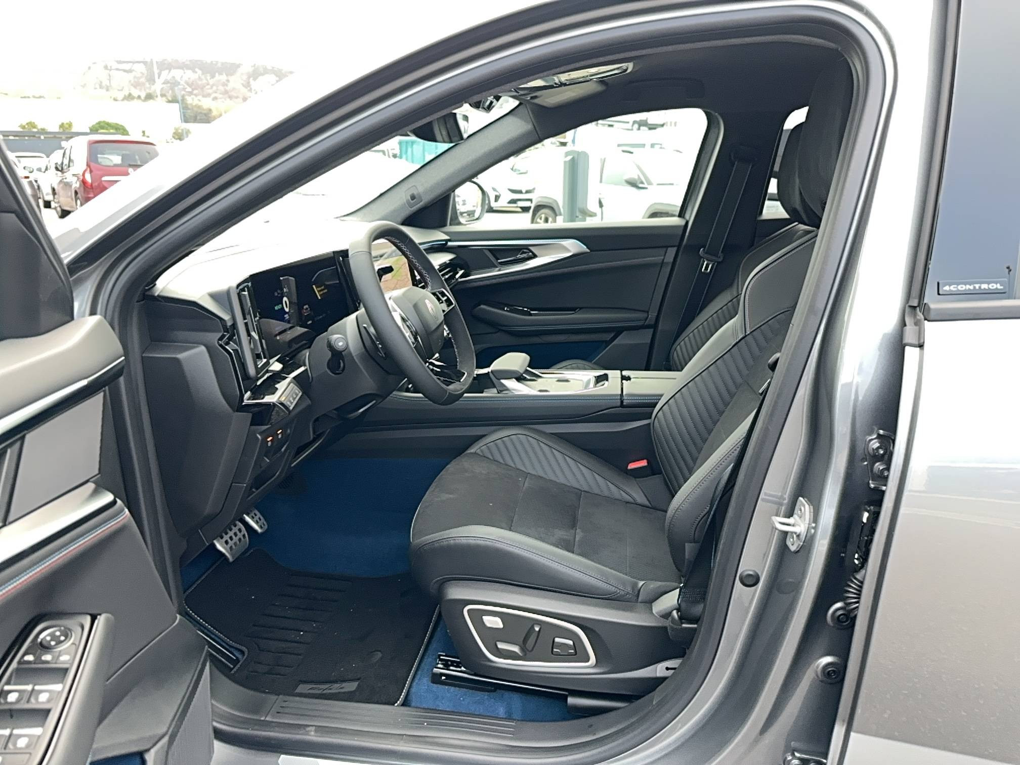 - Sellerie mixte Alcantara avec surpiqûres bleues et logo Alpine lumineux