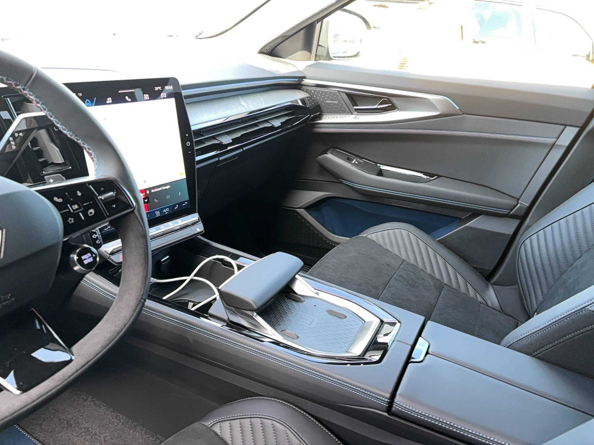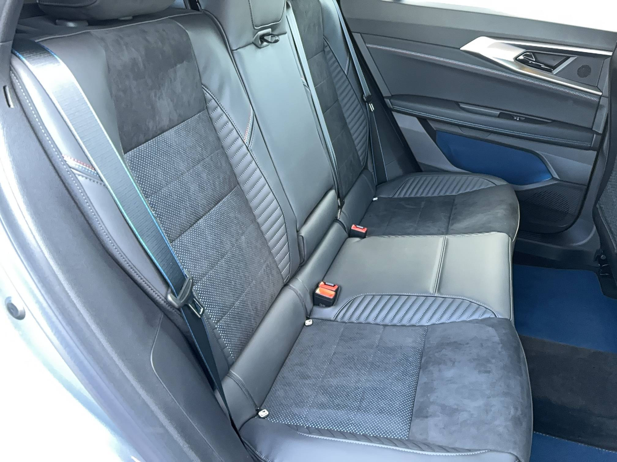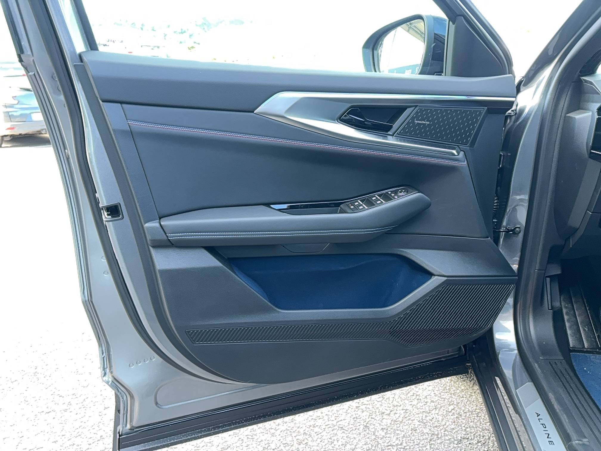 - Sellerie mixte Alcantara avec surpiqûres bleues et logo Alpine lumineux