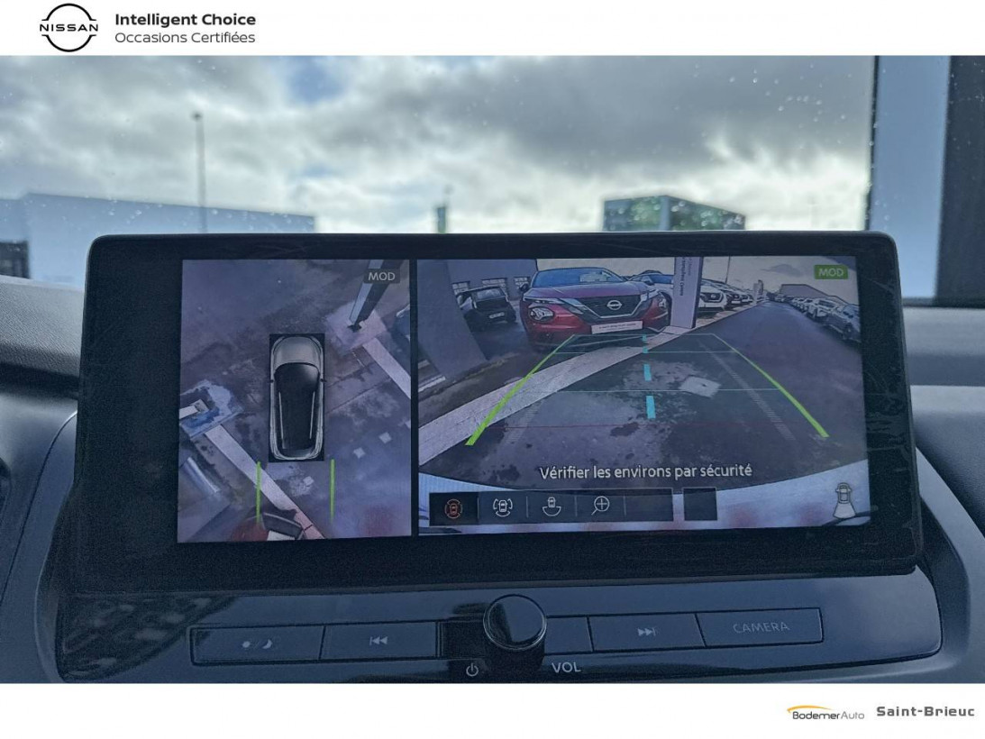 - Nissan AVM 3D - Vision Intelligente à 360° : système d'aide au stationnement qui facilite les manoeuvres de stationnement en vous offrant une vision à 360° : Caméra AR avec repères de gabarit, Caméra AV, Caméras latérales situées dans les rétroviseurs extérieurs, Radars 360°, Fonction ''capot transparent'', Mémorisation stationnement régulier et intersections