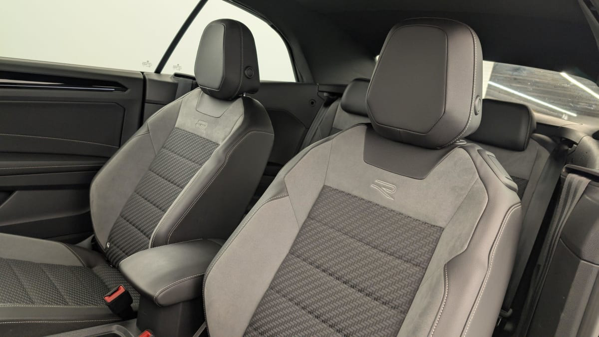 - Sellerie spécifique avec partie centrale en tissu Carbon-Flag, intérieur des bourrelets latéraux en microfleece Art Velours. Partie extérieure et appuie-tête en similicuir et surpiqués en Gris. Logo R-Line sur les sièges AV